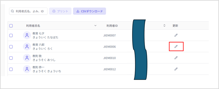 ① 画⾯左下メニュー内の「利⽤者の管理」を押下 ② 利⽤者⼀覧画⾯が表⽰されます。 パスワードを初期化したい利用者の初期化を押下 ③ 「パスワード初期化しますか?」の画面に切り替わりますので、利用者ID/利用者氏名を再度ご確認ください。 間違いがなければ、「パスワードを初期化する」を押下 ④ パスワードが初期化されましたので、利用者へログイン情報を共有する必要があります。 「ログイン情報をプリント」を押下 ⑤ ...