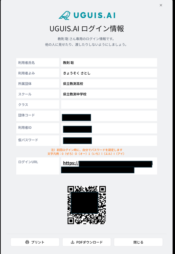 ⑤ 表⽰されたログイン情報(仮パスワード含む)を印刷または、PDFでダウンロードし利用者本人へ共有してください。