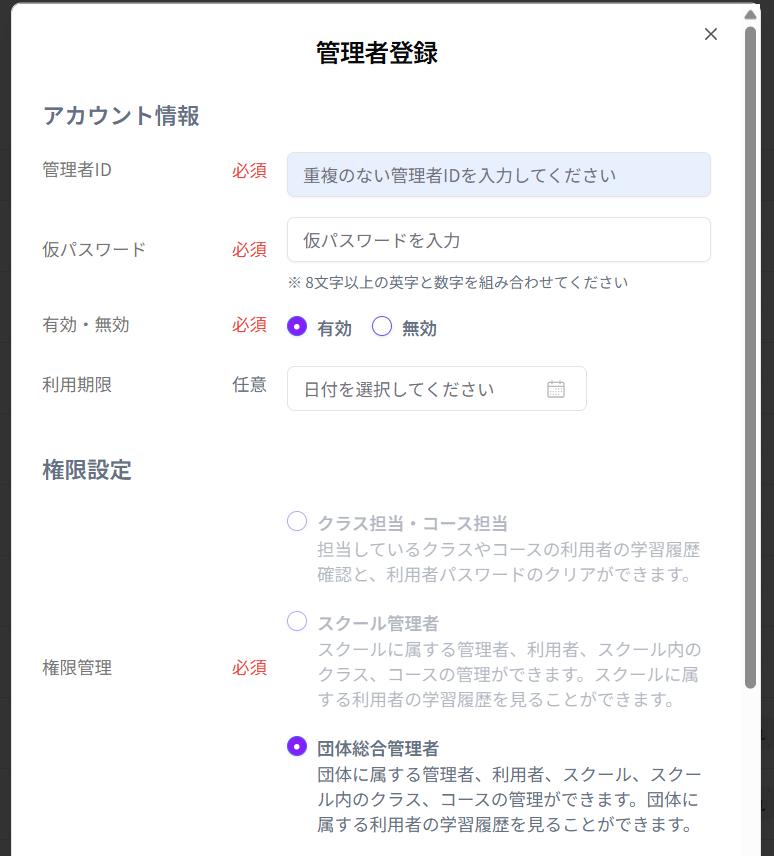 ※登録後、管理者の「権限管理」は修正することはできませんのでご注意ください。