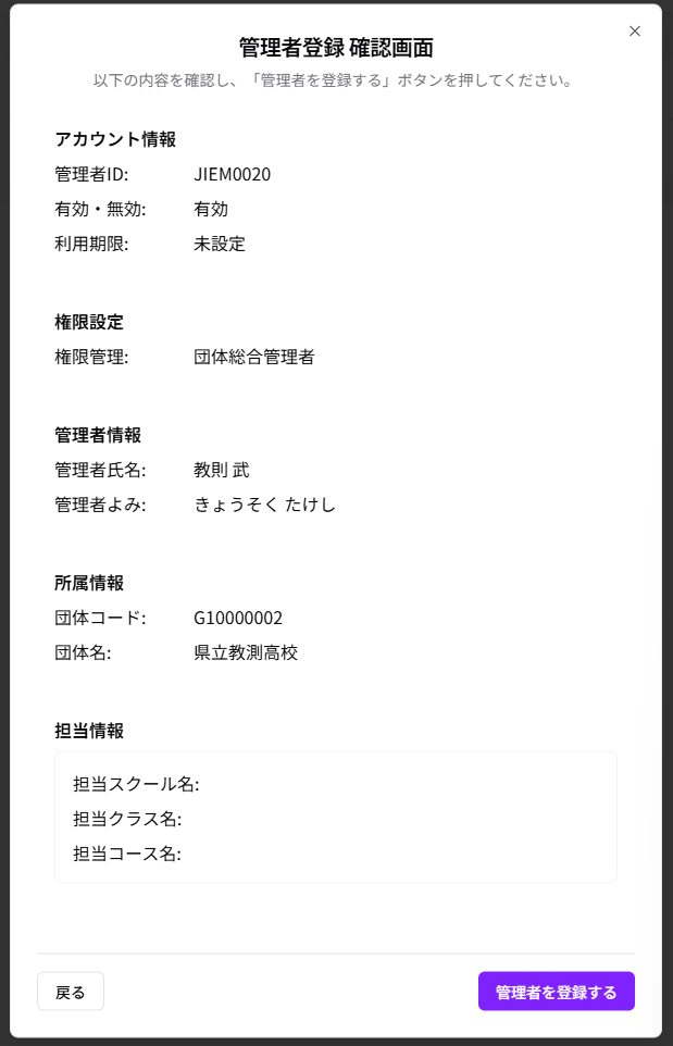 ⑤ 登録内容を確認し、「管理者を登録する」を押下