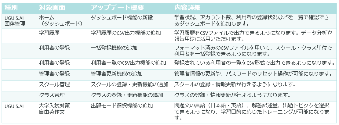 6月23日(月)のアップデートにより、「UGUIS.AI」および「UGUIS.AI団体管理」に以下の新機能が加わりました。