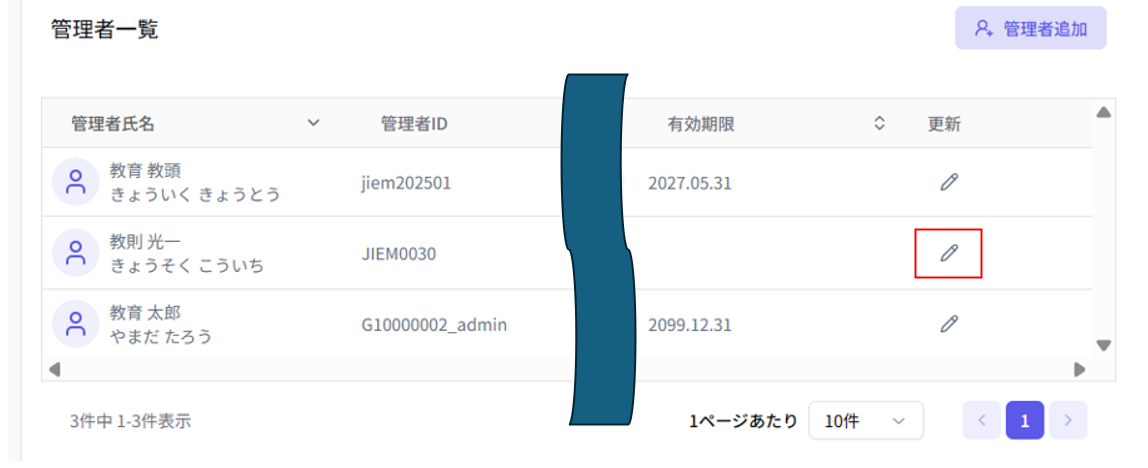 編集したい管理者の右手にある「更新」の✐マークを押下