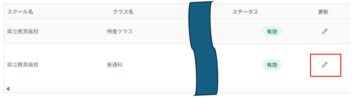 ①画面左下「スクール管理」を押下 ②更新したいスクールの✐マークを押下 ③スクール更新画面で項目を変更 ④「スクールを更新する」 を押下