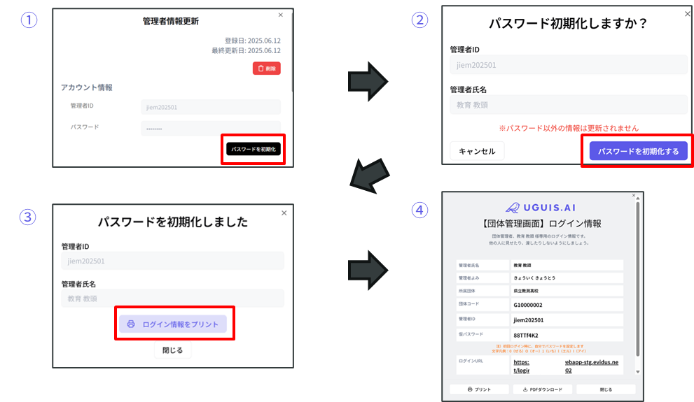 ① 画⾯左下メニュー内の「利⽤者の管理」を押下 ② 利⽤者⼀覧画⾯が表⽰されます。 パスワードを初期化したい利用者の初期化を押下 ③ 「パスワード初期化しますか?」の画面に切り替わりますので、利用者ID/利用者氏名を再度ご確認ください。 間違いがなければ、「パスワードを初期化する」を押下 ④ パスワードが初期化されましたので、利用者へログイン情報を共有する必要があります。 「ログイン情報をプリント」を押下 ⑤ ...