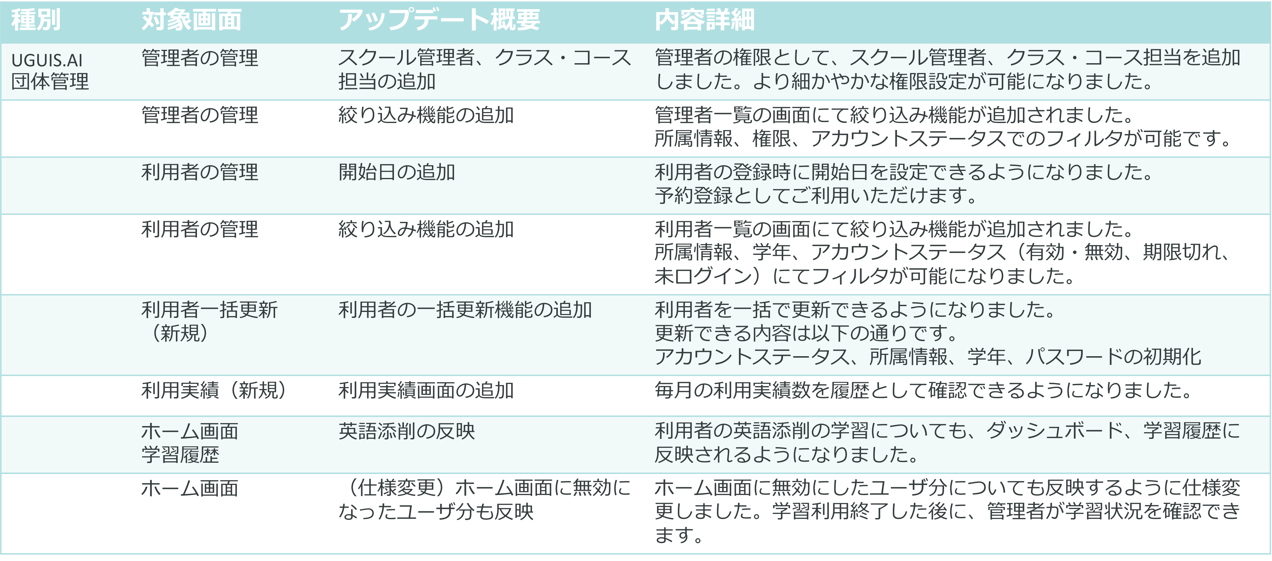 6月23日(月)のアップデートにより、「UGUIS.AI」および「UGUIS.AI団体管理」に以下の新機能が加わりました。 各機能の詳細な使い方につきましては、マニュアルをご参照ください。